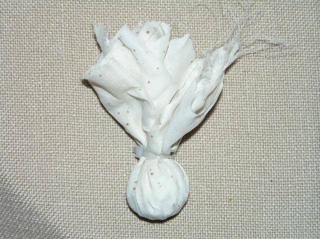 Then, it is simple to just pick the fabric up by the corners, allowing the shot to pool in the center of the square. I learned to shake the fabric and shot just a bit to get the shot settled in the pocket of the fabric. Then, I gathered the fabric at the top, and gave it a quarter twist above the shot to further gather the fabric. Then, I would wrap and lightly secure the cable tie at the location of the twist. At first I used two cable ties, but later determined that two ties were not needed for my application.