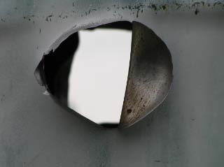 We had hoped that the cannon shot would explode the drum - turn it inside out. We were disappointed. The ball blew clear through the drum. It swelled the top nicely, but didn't burst the drum.