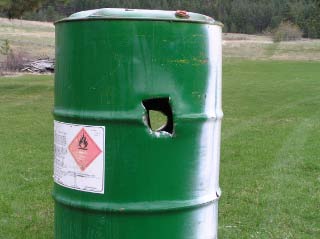 It really began because I had a 55-gallon drum I needed to trash. But, the local trash company won't haul drums that are intact - must have a hole (or holes). Fine, I thought, I can make holes, but I might as well have fun too. So, friend Corey and I filled the drum with water, capped it, and lined it up in front of the cannon.